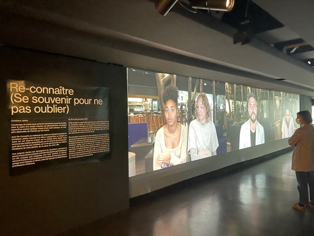 Les participants ont été interviewés en direct devant un public. Leurs témoignages ont été ajoutés à une installation vidéo, rejoignant la bibliothèque croissante d’histoires, transformant l’espace d’installation de Re-connaître en une archive vivante reliant le très personnel et intime à l’histoire, donnant à cette histoire une dimension radicalement contemporaine.
